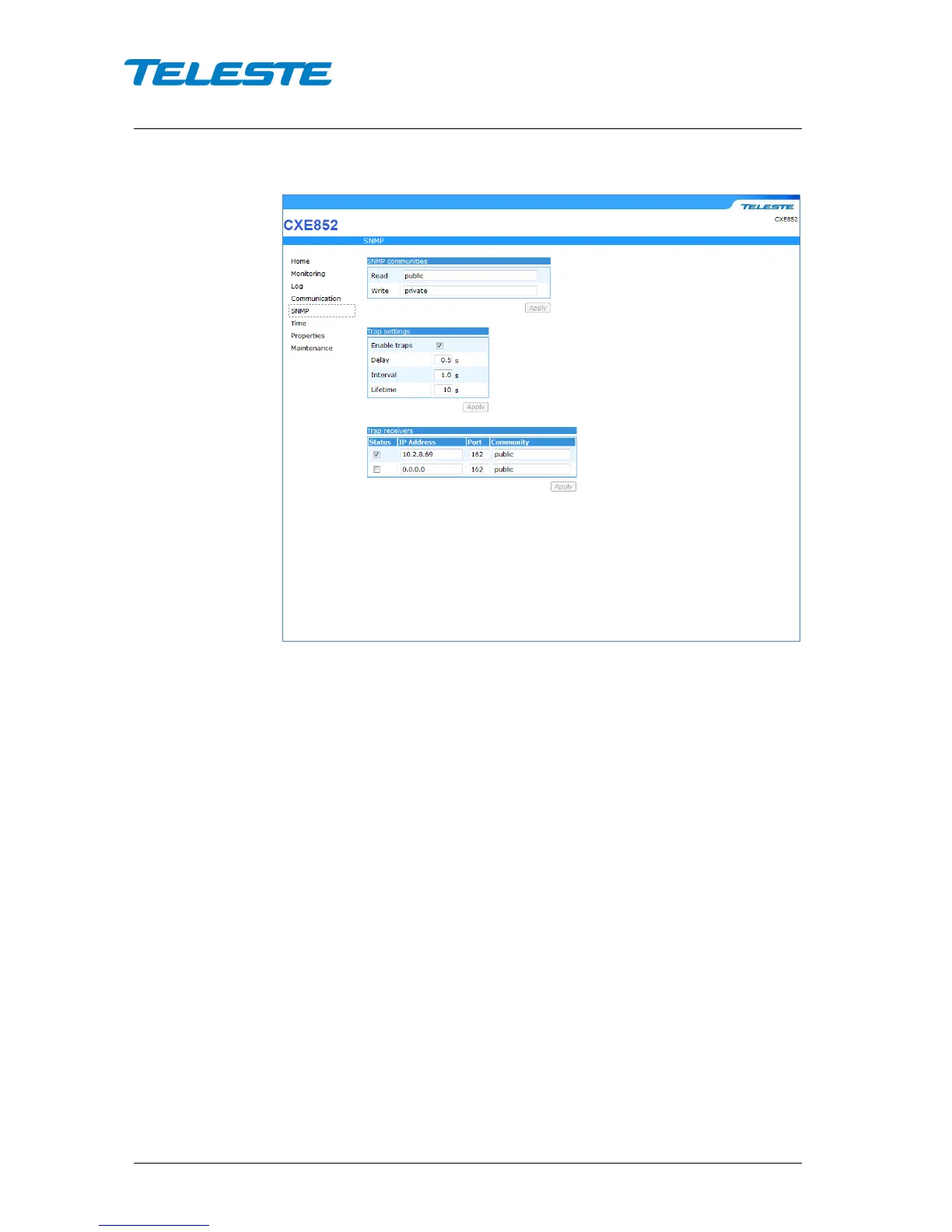 CXE85x can send SNMP traps up to two IP addresses, with separate port