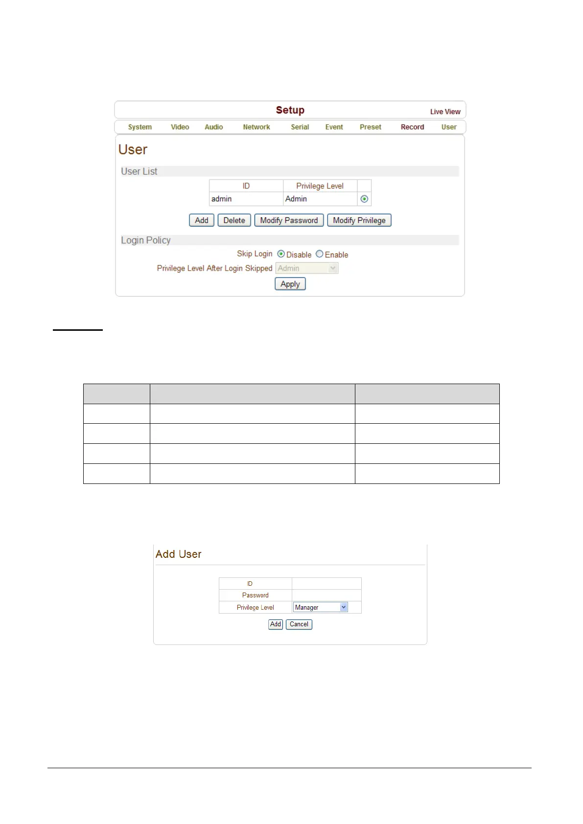 Enter User ID and password (Up to 15 characters) and select Privilege Level.