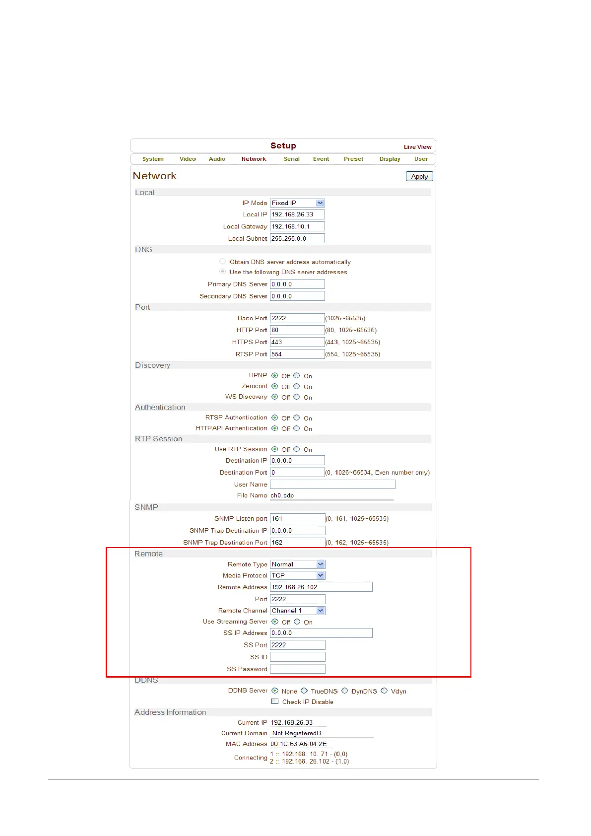 Network configuration page has a section for specifying the remote system to be connected to (MCC encoder