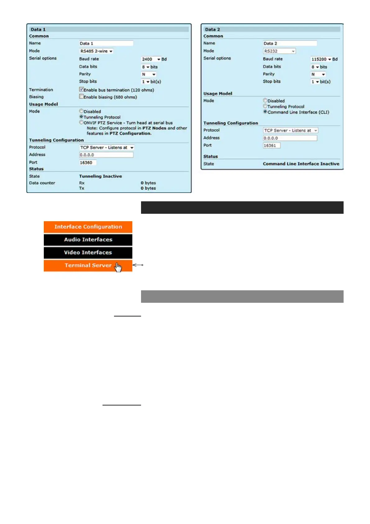 RS422, RS485 2-wire and RS485 4-wire (Data 1) and RS232 (Data 2)