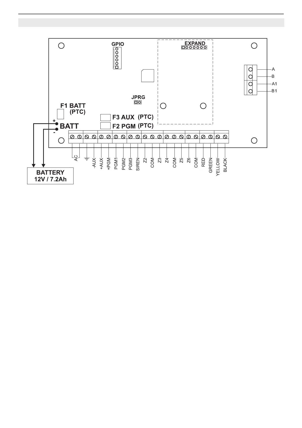 • F3 AUX - Fuse for powering sensors, programmable outputs and keyboards 0.5А, Resettable (PTC)