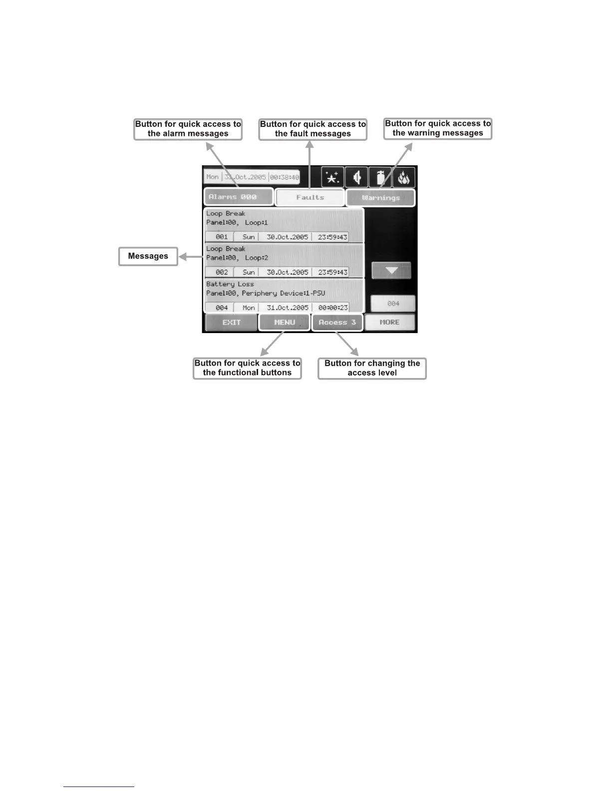 Purpose – Indicates the current status of the fire alarm panel, containing detailed information on the access