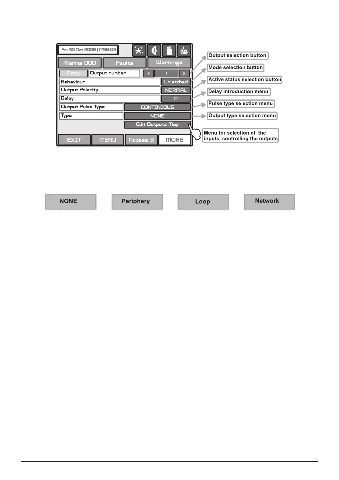 • NETWORK - Panel / repeater number and output number, to which the output shall be attached. Choose