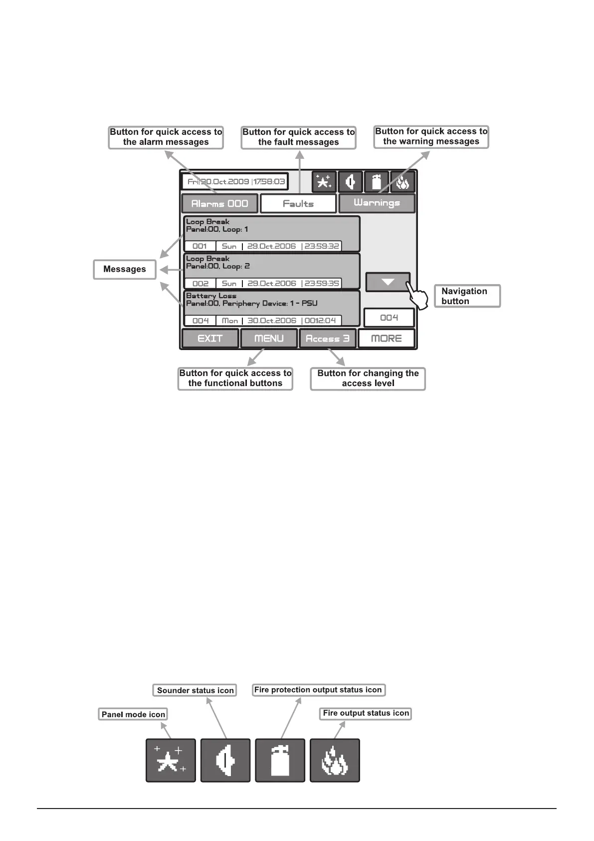 Purpose – Indicates the current status of the re alarm panel, containing detailed information on the access