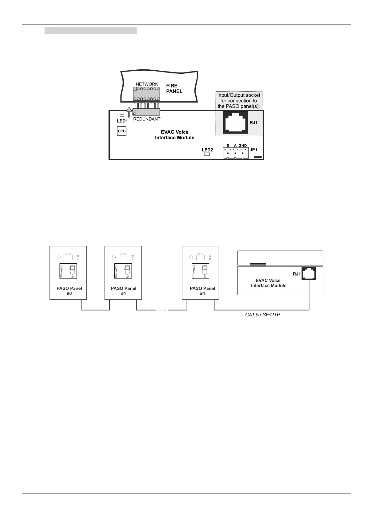 evacuation and/or sound management systems. The connection is realized via Evacuation Voice Module mounted