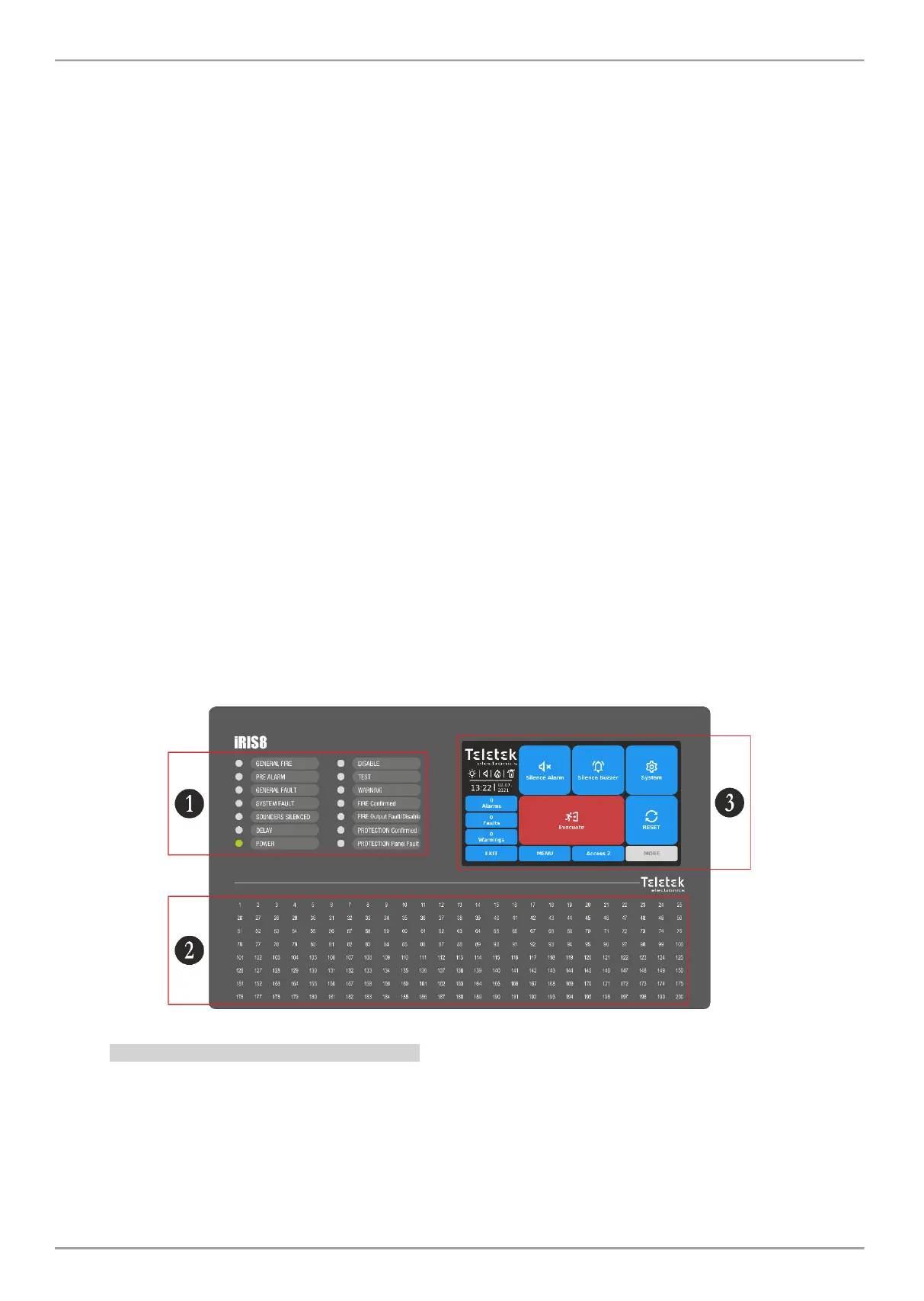 The front panel of iRIS8 presents detailed information of the current system status (1) and activated zones (2) via LED