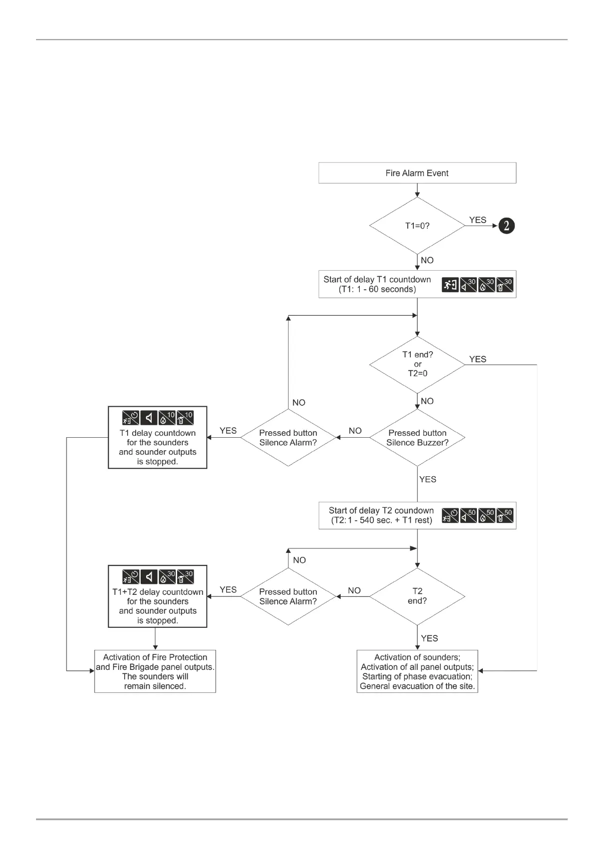 Note: The set time delays for activation of the sounders and the panel outputs - T1 and T2 - will start running, when are