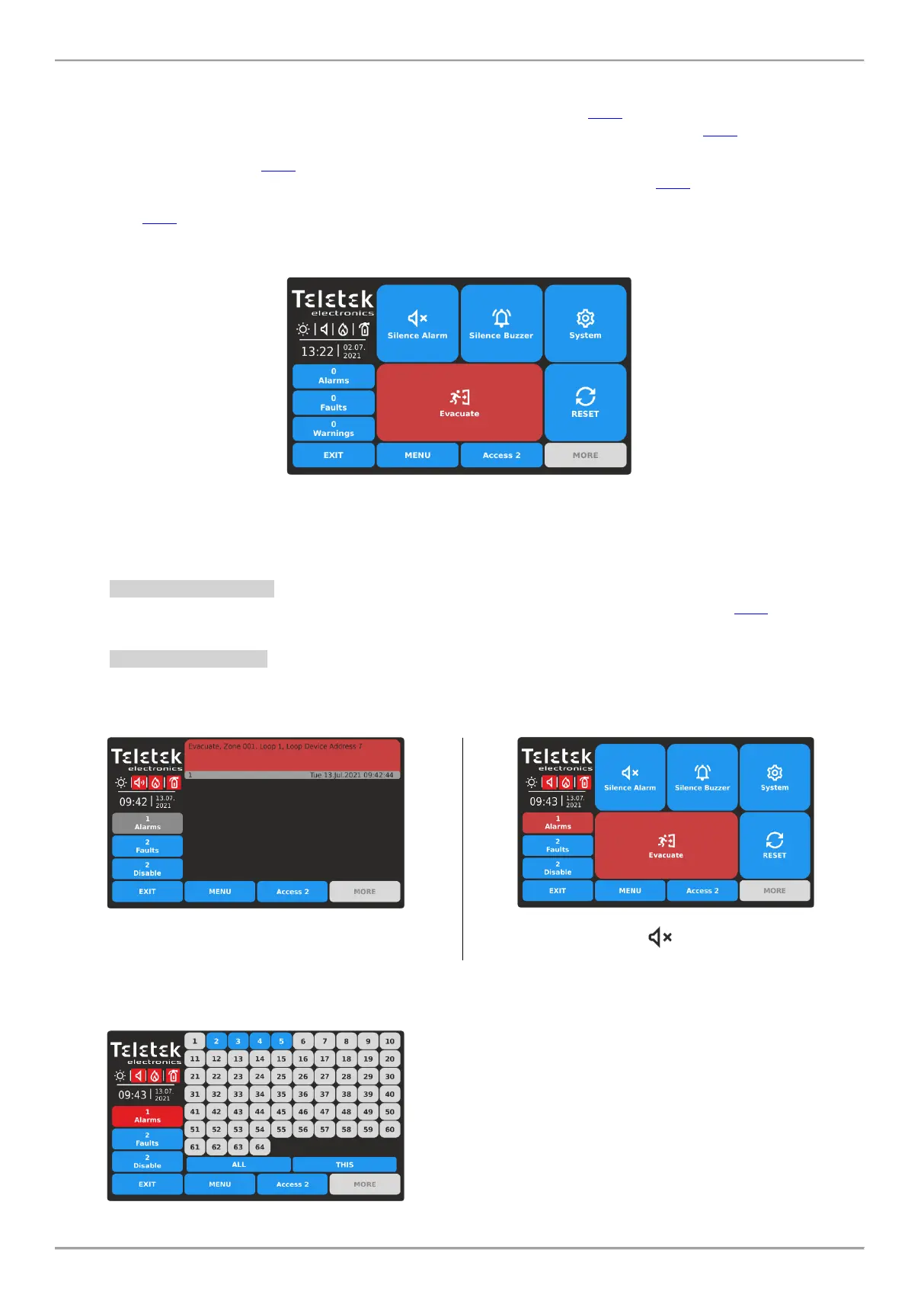 for the fire alarm. In that case the User can return to Main Screen, pressing the MENU or EXIT button and to Silence the
