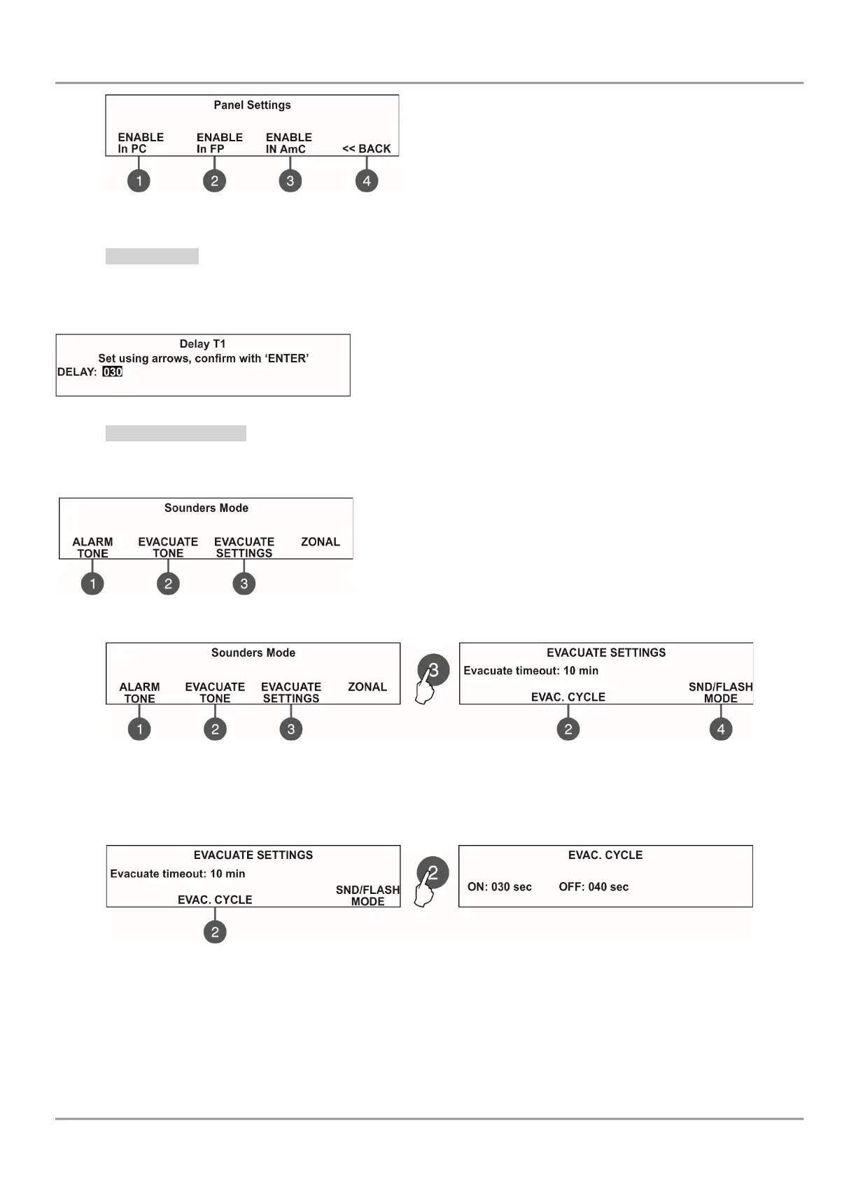 (3) EVACUATE SETTINGS – Press it to review the evacuation settings for sounders operation.