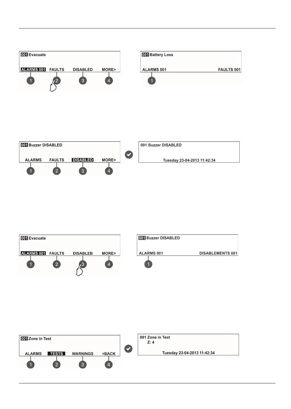 In case, there are active alarms and/ or faults in the system, but you want to review the disablements, press button (3) –
