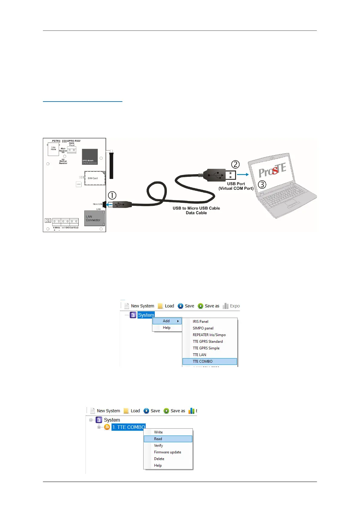 To connect the TTE Combo to a local computer or laptop for programming, use a standard USB-Micro