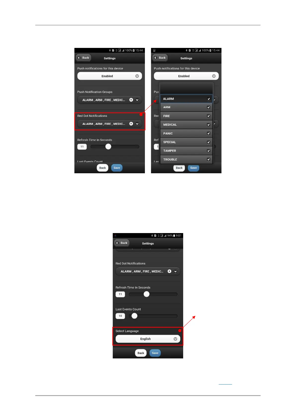 In Settings menu the user can also set the visualization of events via red dot in the system list. Select