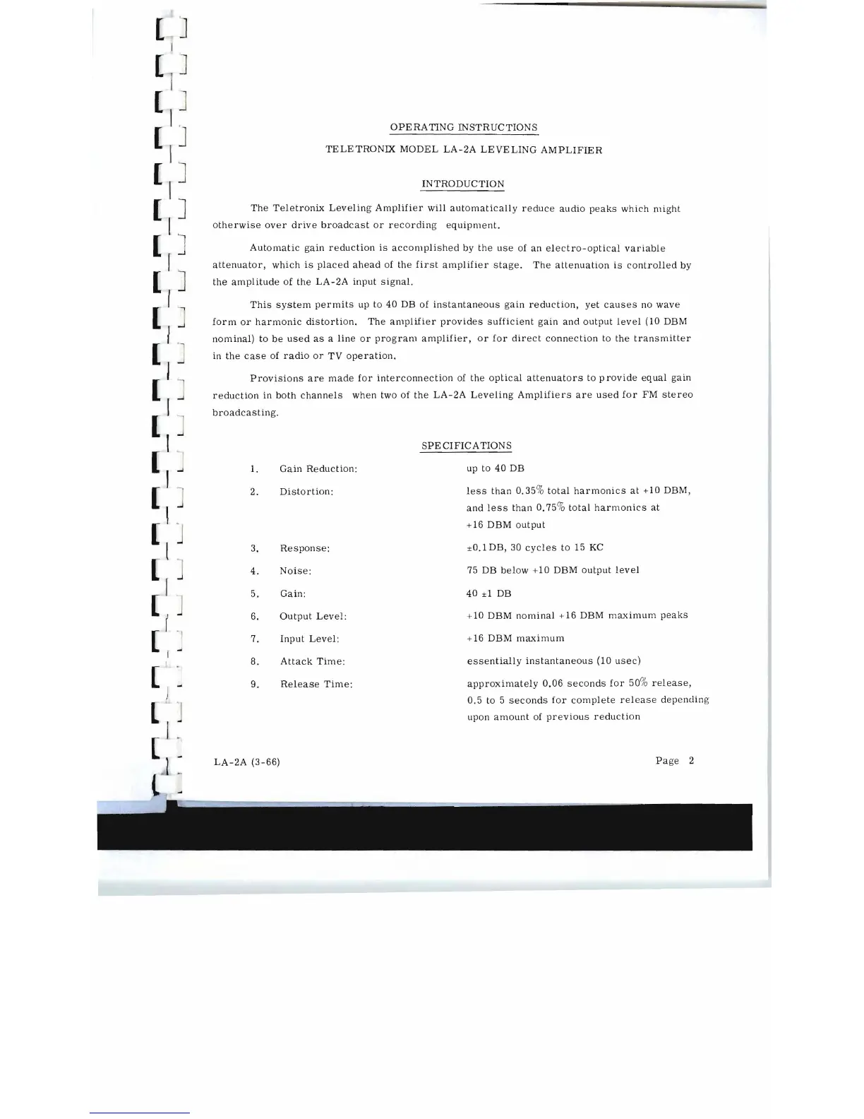 TELETRONIX LA-2A - OPERATING INSTRUCTIONS; INTRODUCTION; SPECIFICATIONS
