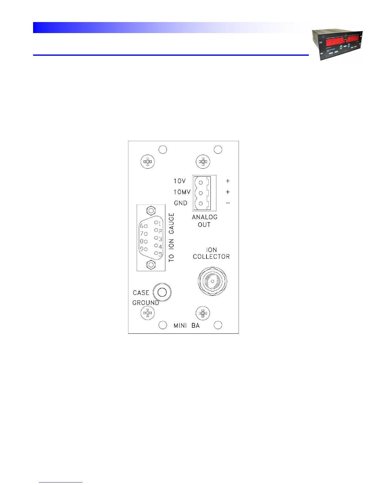 The rear panel of the hot cathode mini-BA module is shown below. The gauge tube cables are connected to the ion