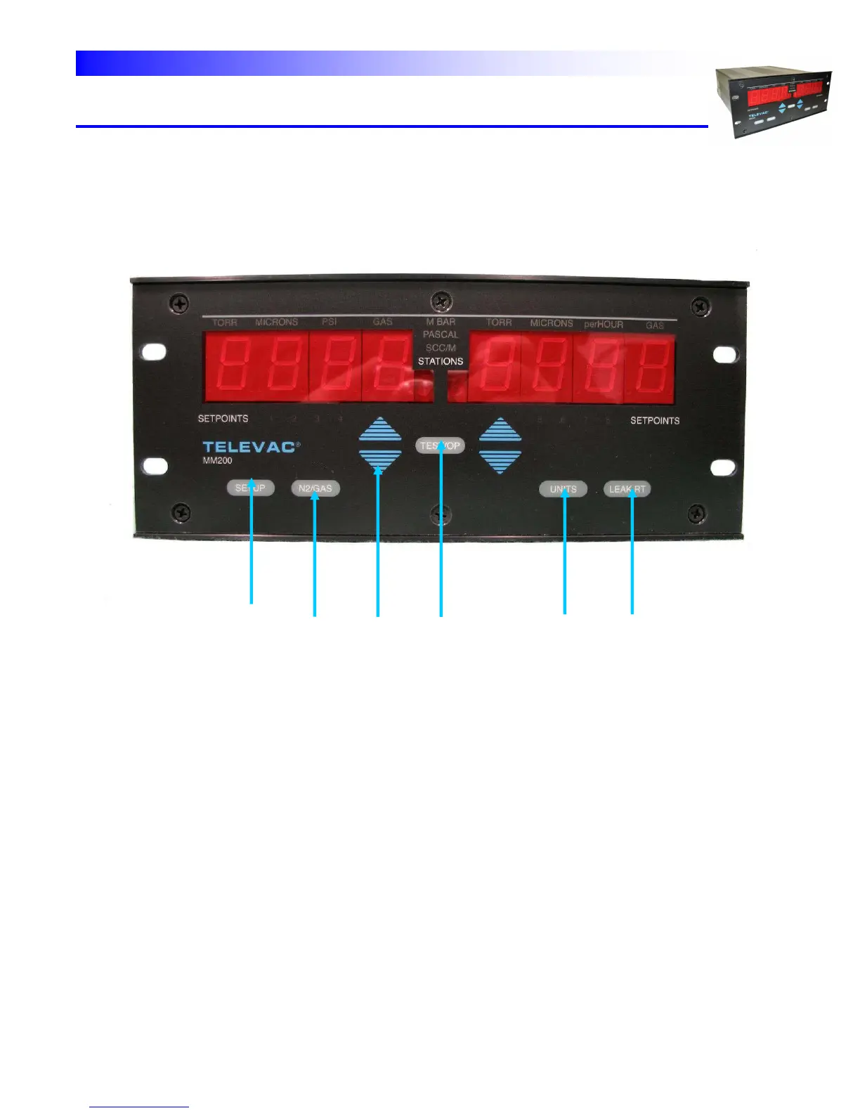 Fig. 4.2 shows the front panel of the gauge controller with the various control pushbuttons identified.