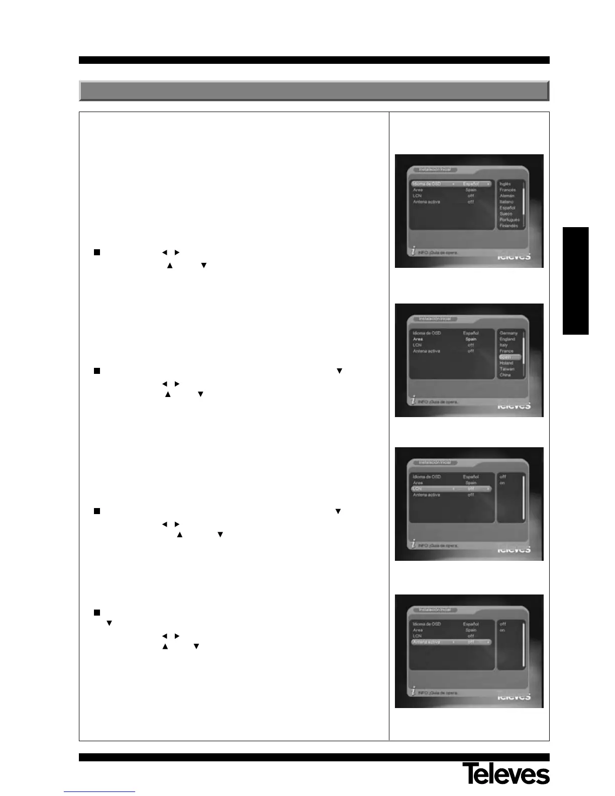 Este menú está formado por cuatro opciones: Idioma de OSD, Area, LCN y