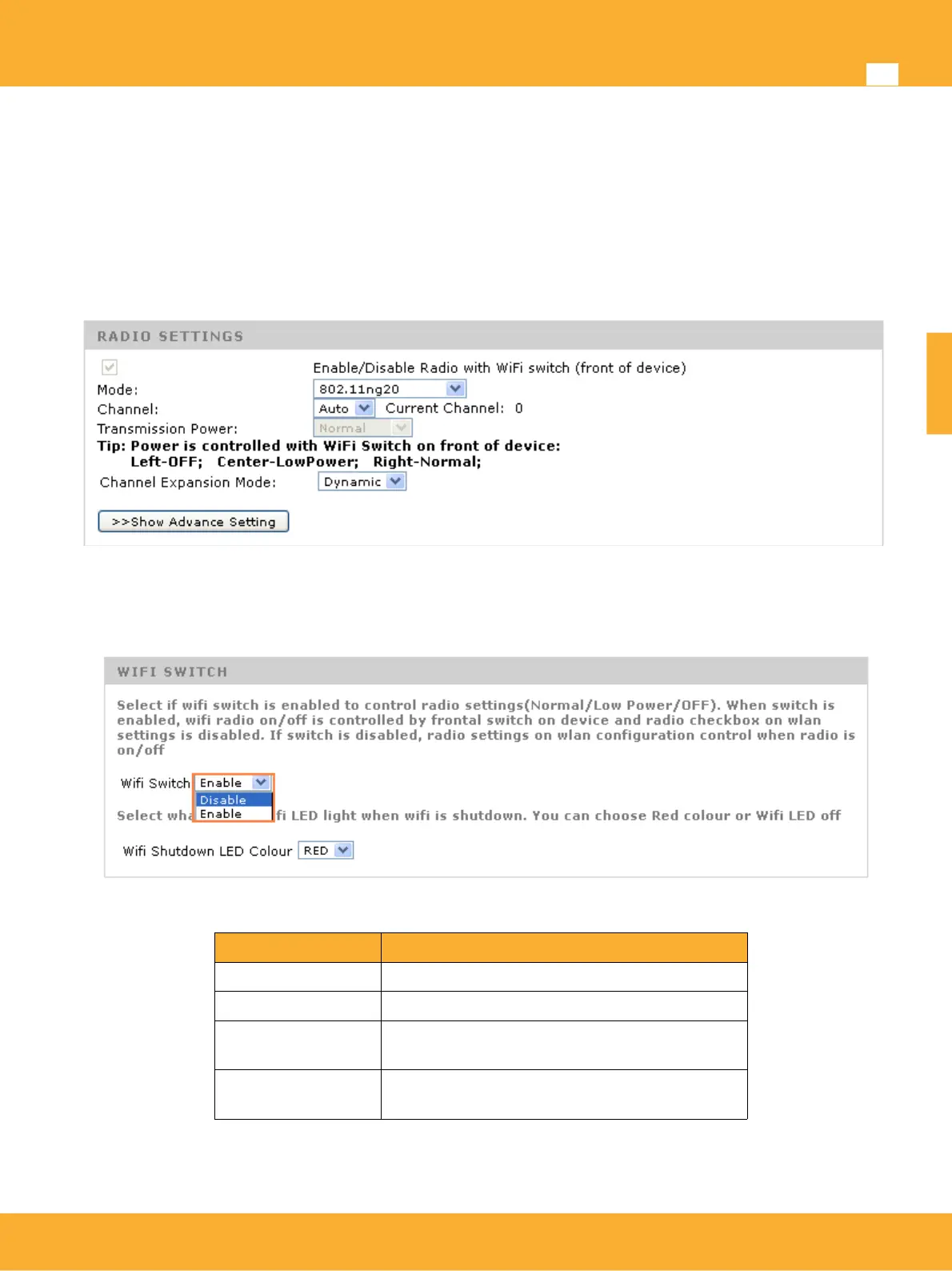 Enable Radio: Activate WiFi network. This option is controlled by the switch located on the front