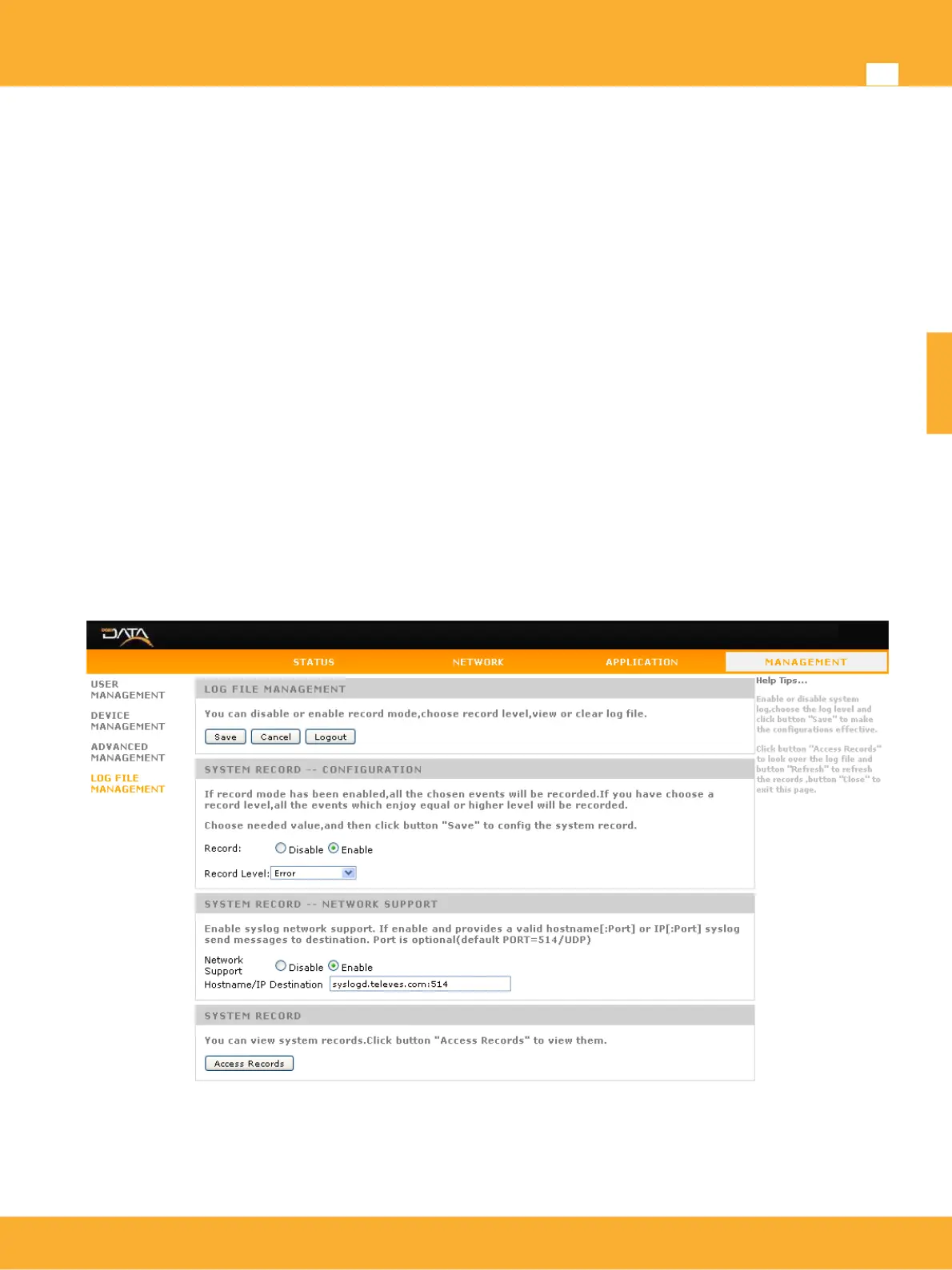 • Network Support: Network Support: Enables sending of logs generated by the system to a remote