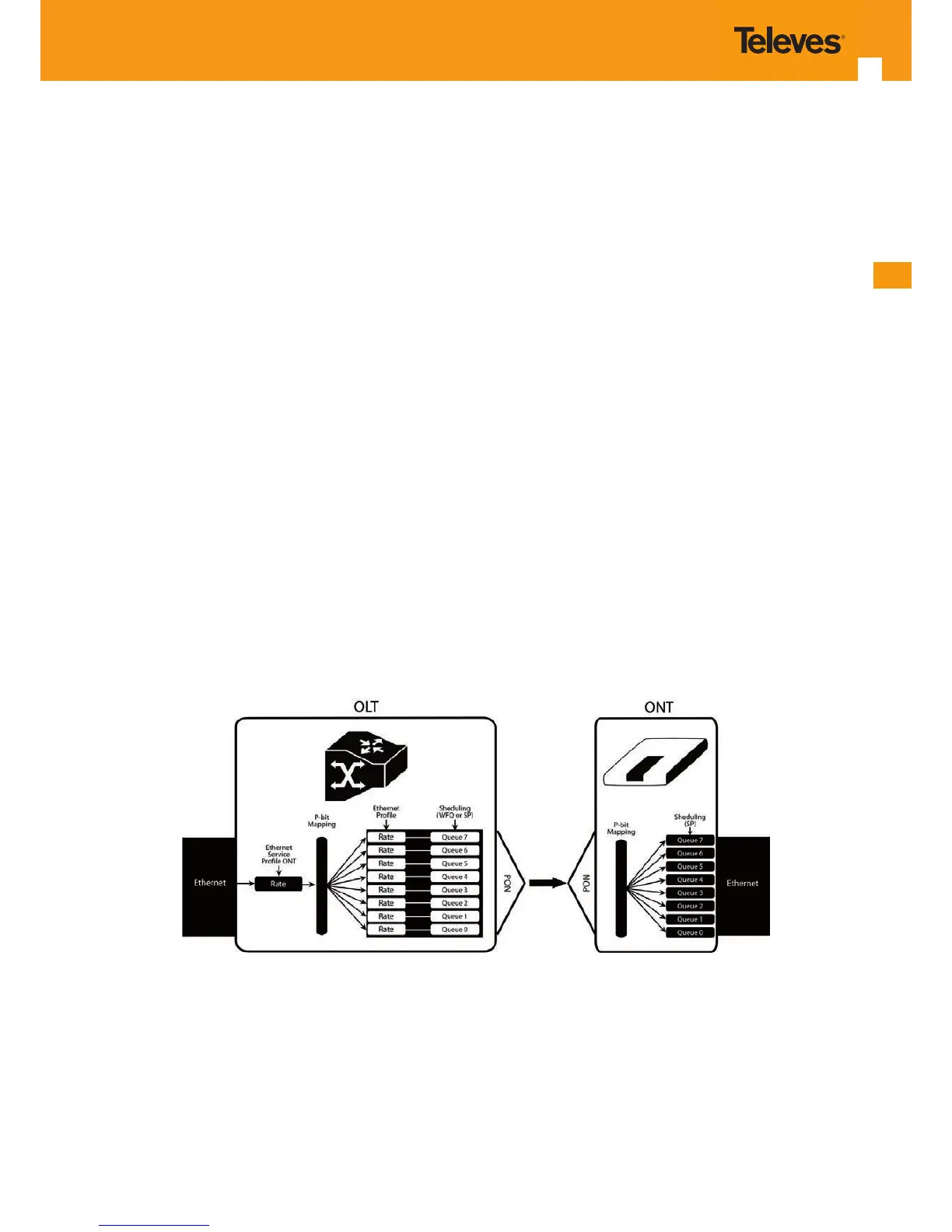 the trac ows to the GPON interface and when it arrives to the ONT it will pass by a mapping block which will map the trac in one of the eight