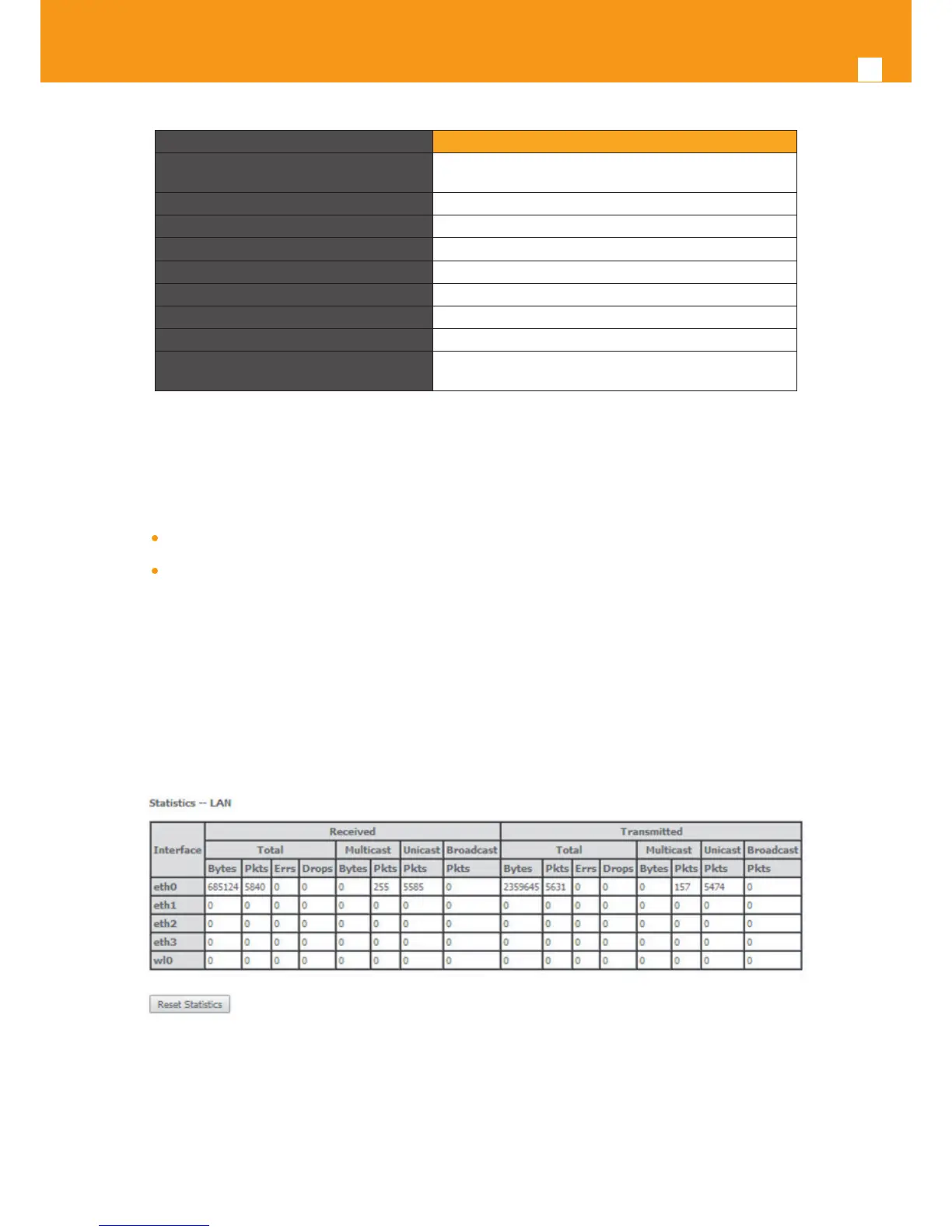 Received and Transmitted Total and per type of trac Statistics will be displayed for each LAN interface with trac. LAN statistics parameter de-