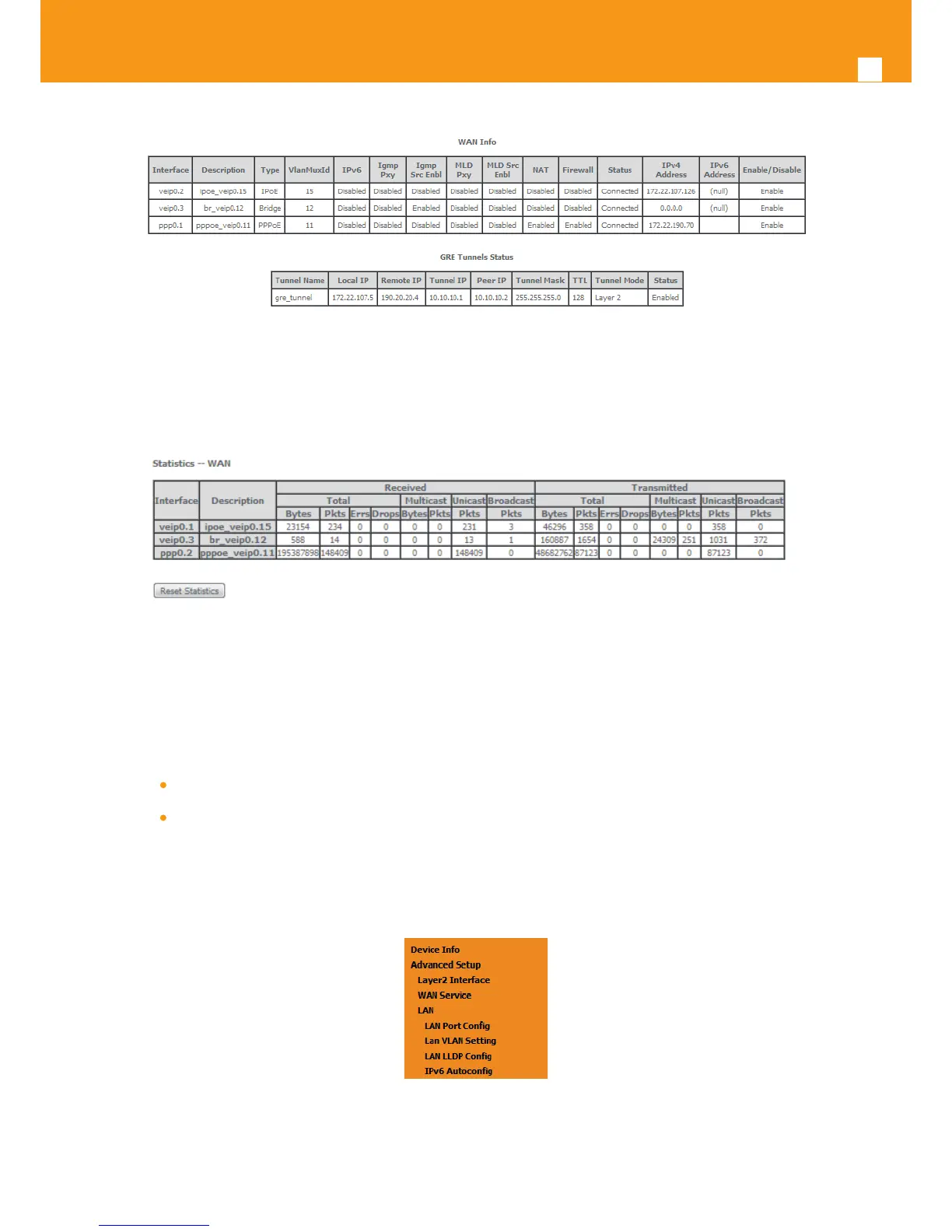 Service statistics can be obtained by selecting at the menu Device Info the submenu Statistics, item Wan; a Services-WAN statistics window will