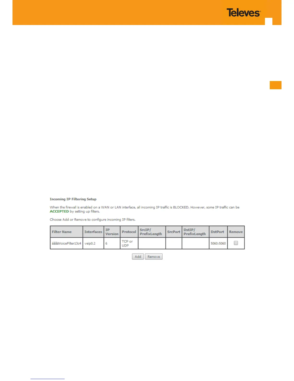 To nalize the conguration use the Apply/Save button. The next displayed window is the initial window, showing the current Incoming IP Filter-