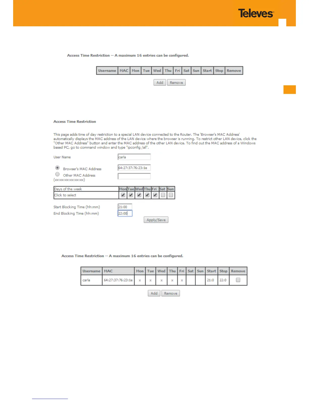 Figure 5-104: Advanced Setup, Parental Control – Time Restriction Conguration window - Current conguration