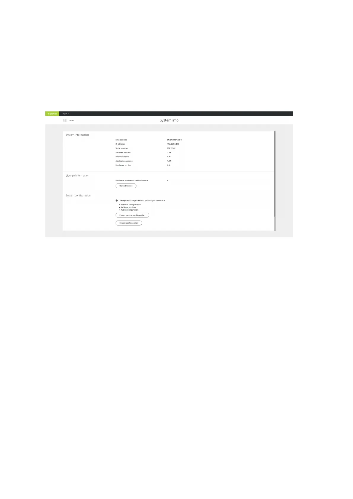 On the System info page you can find different general transmitter settings such as the MAC address, as