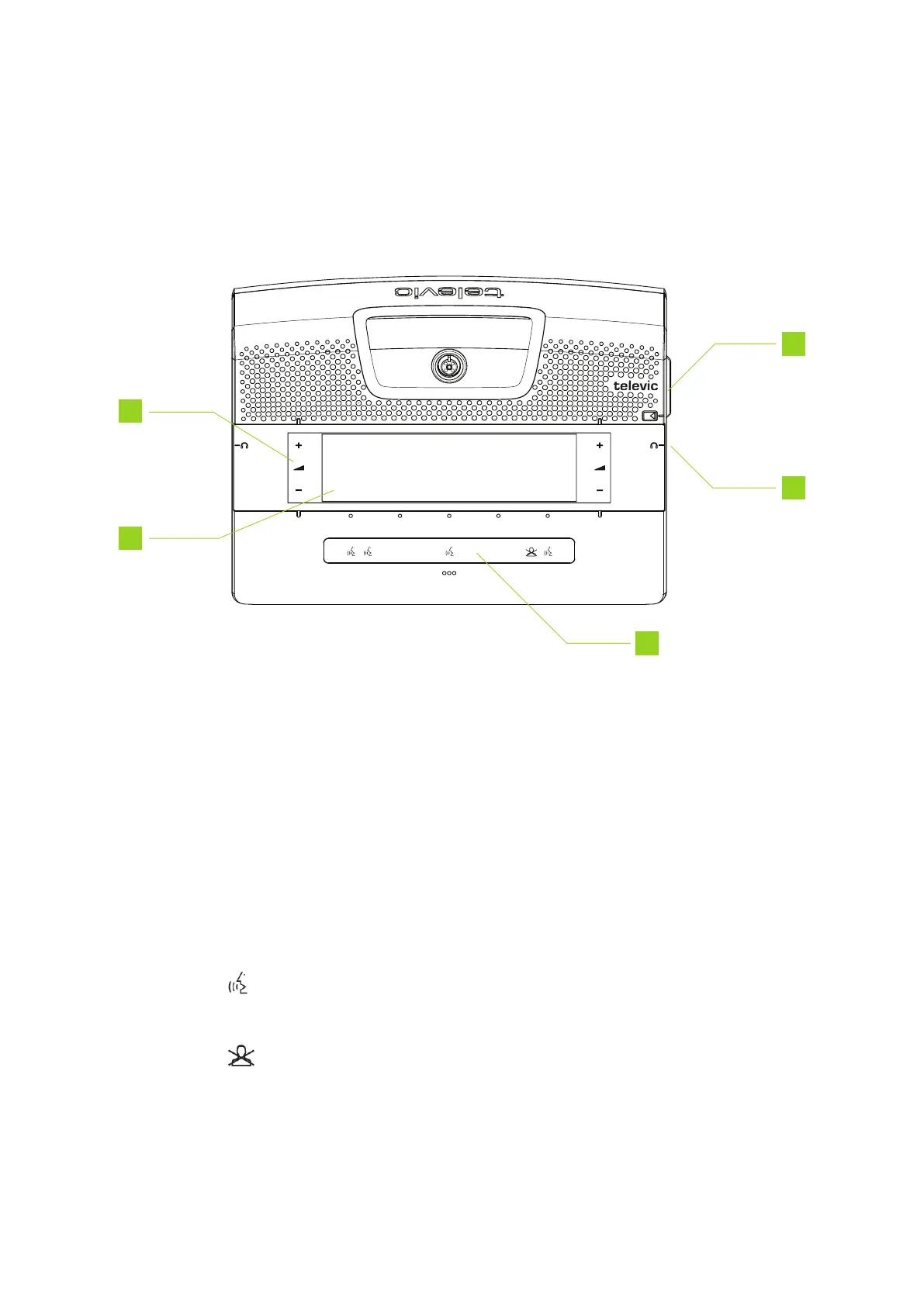 b. : PRIOR button: press and hold to temporarily mute all microphones or press and