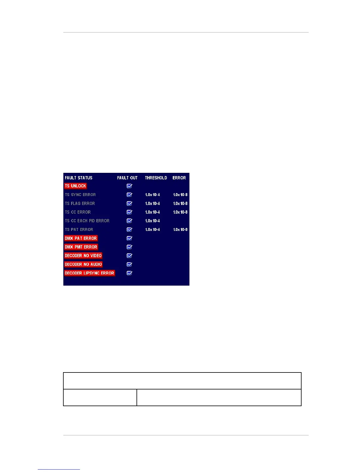 FAULT OUT/MAIN/THRESHOLD: Maximum tolerable error rate (default is 1.0X10-4). Fault out signal