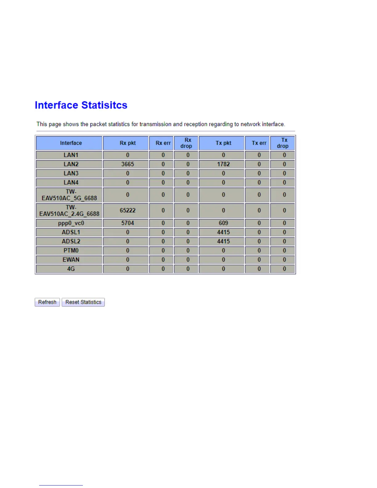 This page shows the statistics (Receive/Transmit packets, Receive/Transmit errors, Receive/Transmit drops) of