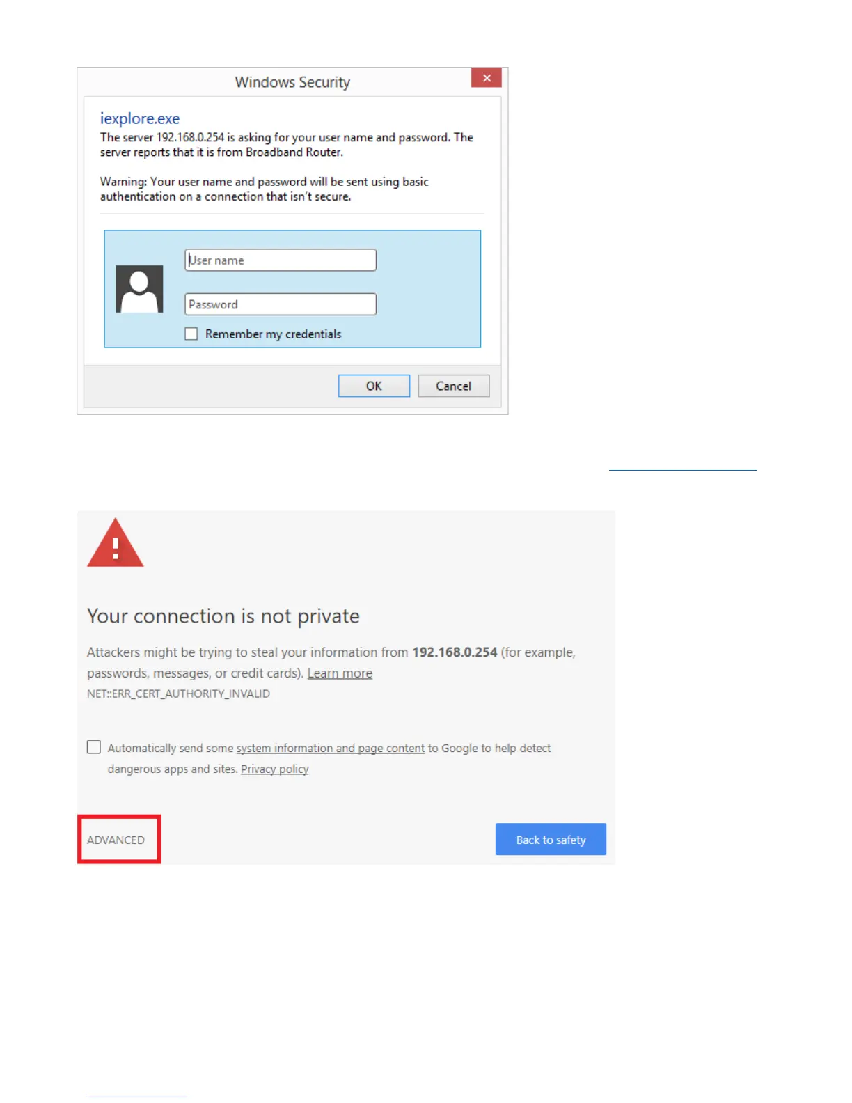 Just click the link “ADVANCED”, and then click link “Proceed to 192.168.0.254 (unsafe)” to establish