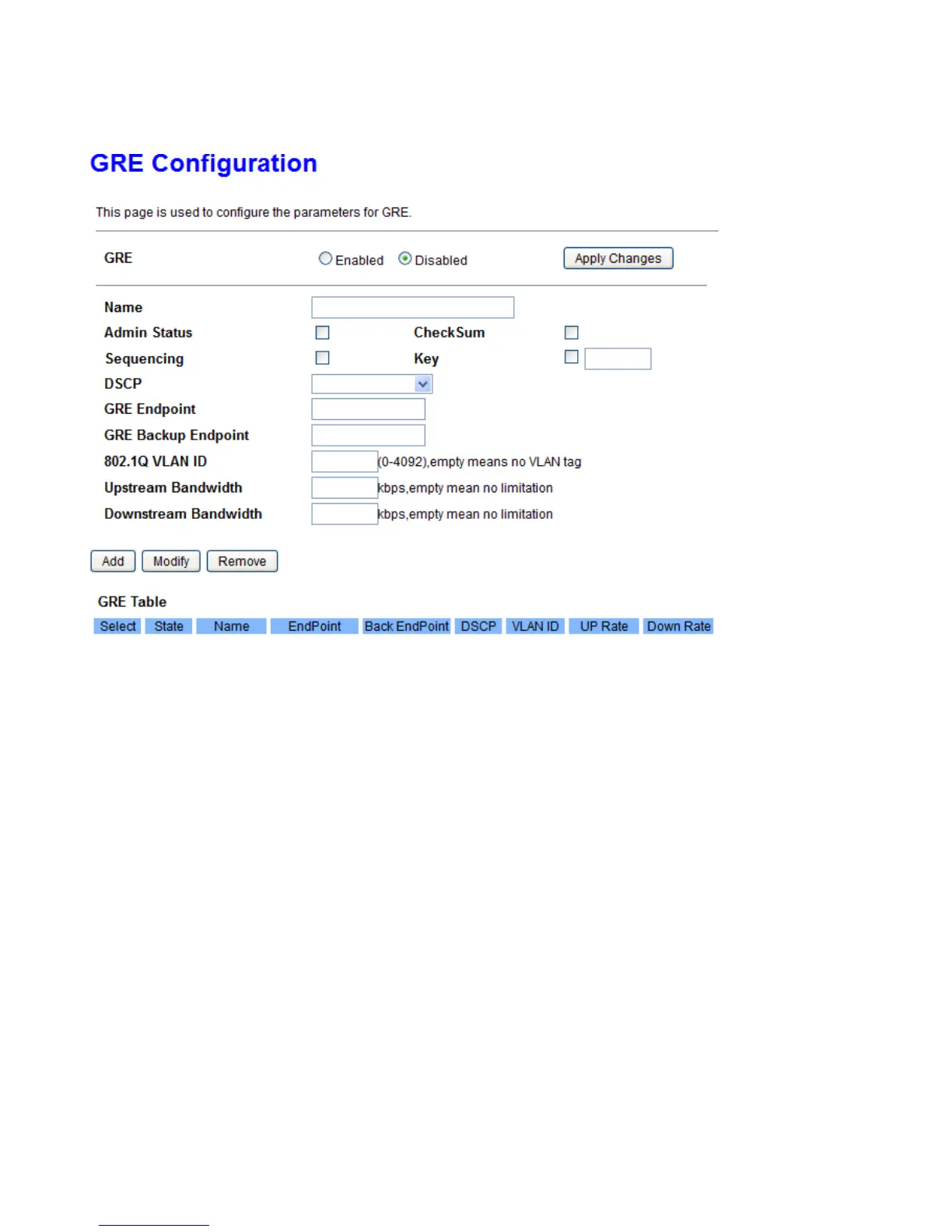 GRE: Choose to enable or disable the GRE feature. Press Apply Changes to submit your changes.
