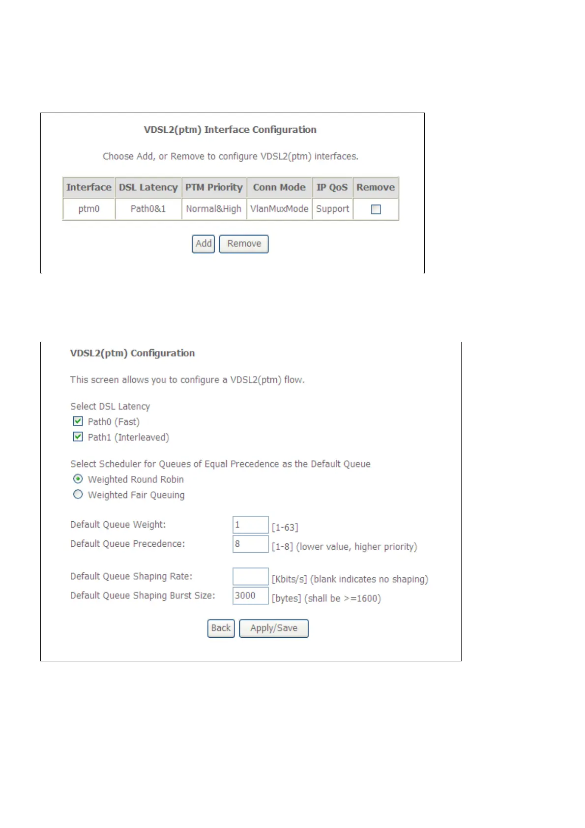 The VDSL2 (ptm) interface Configuration window enables you to add, delete, or modify up to