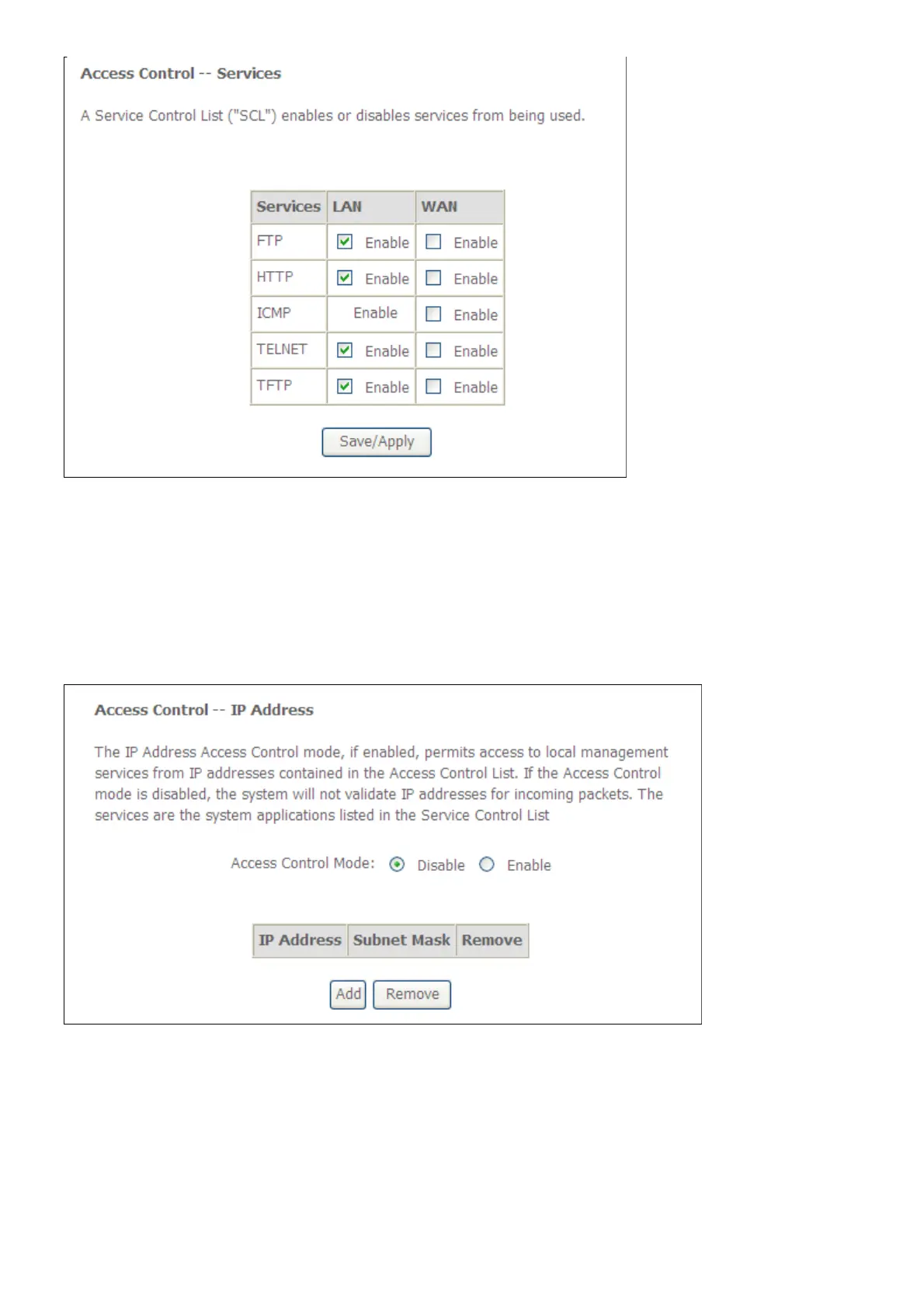 services from IP addresses contained in the Access Control List. If the Access Control mode is