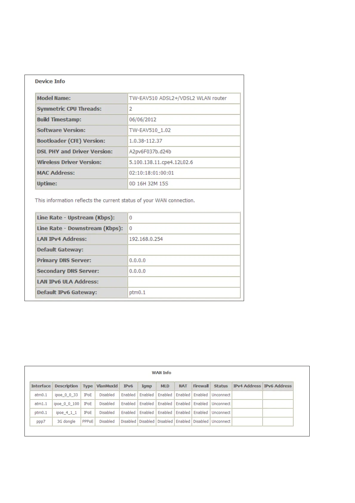 To access the WAN Info window, click the WAN button in the Device Info directory.