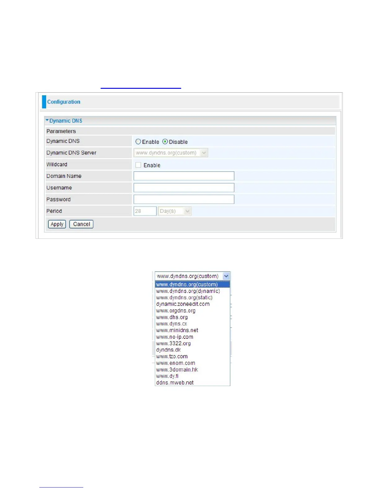 Default is disabled. Check Enable to enable the Dynamic DNS function and the
