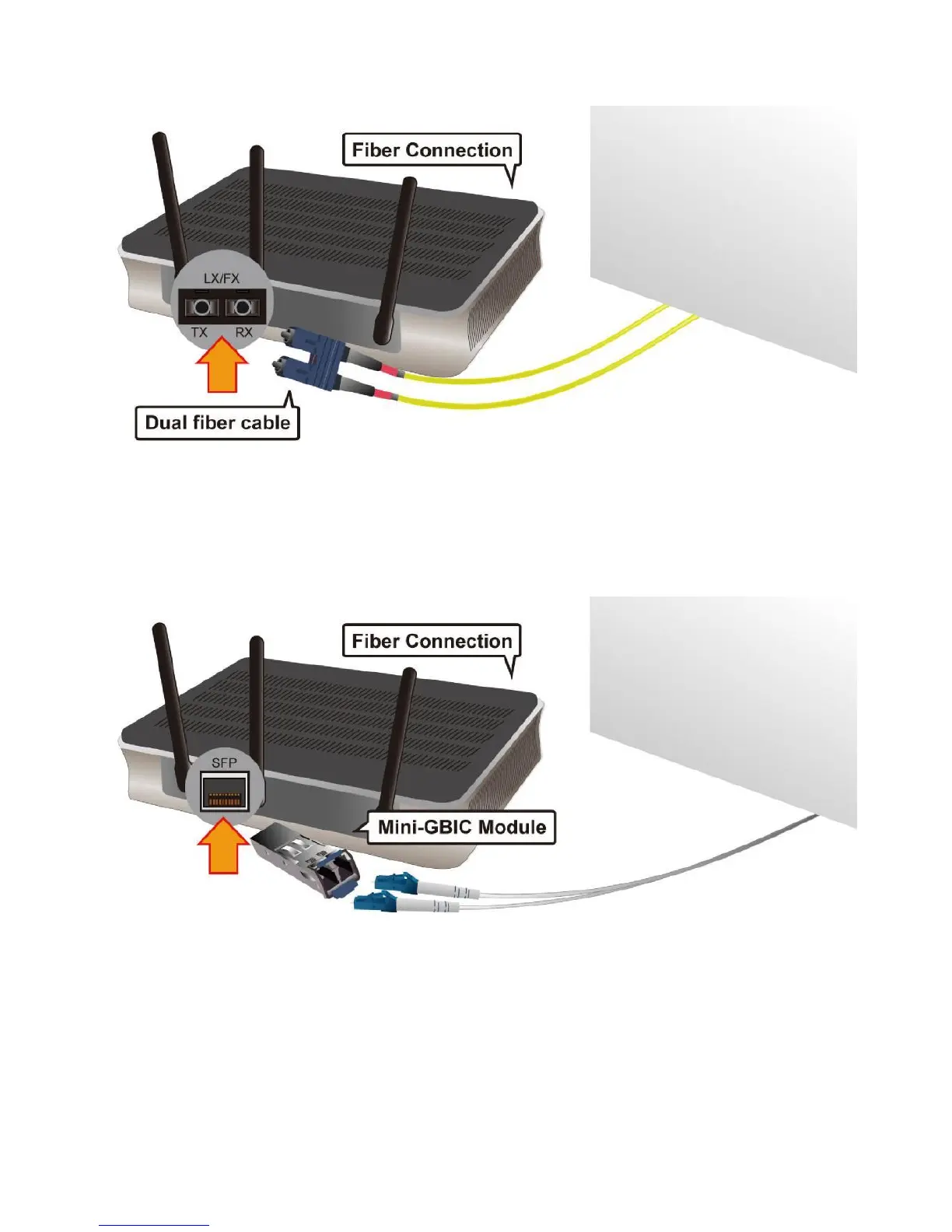 Insert the dual fiber cable into the LX/FX TX and RX jacks separately of the router.