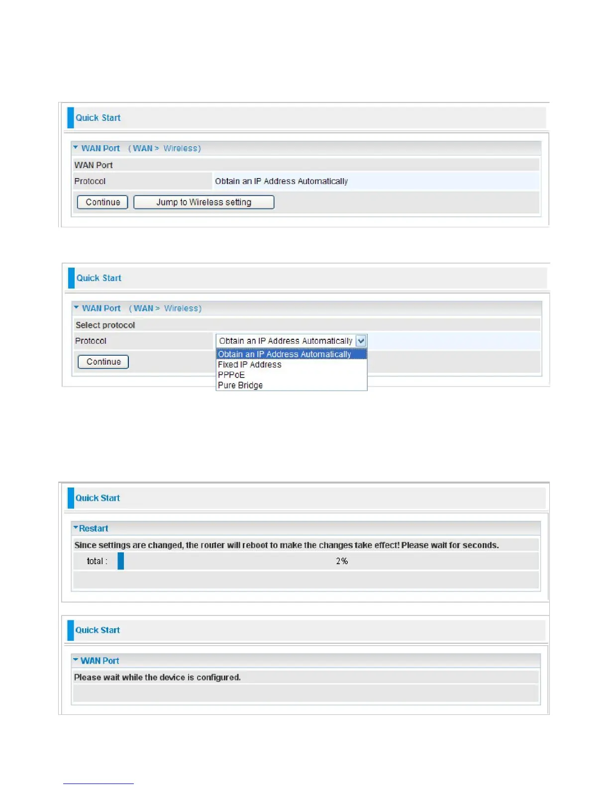 Whether on the Basic or Advanced Configuration Mode, click Quick Start link to WAN Port setup