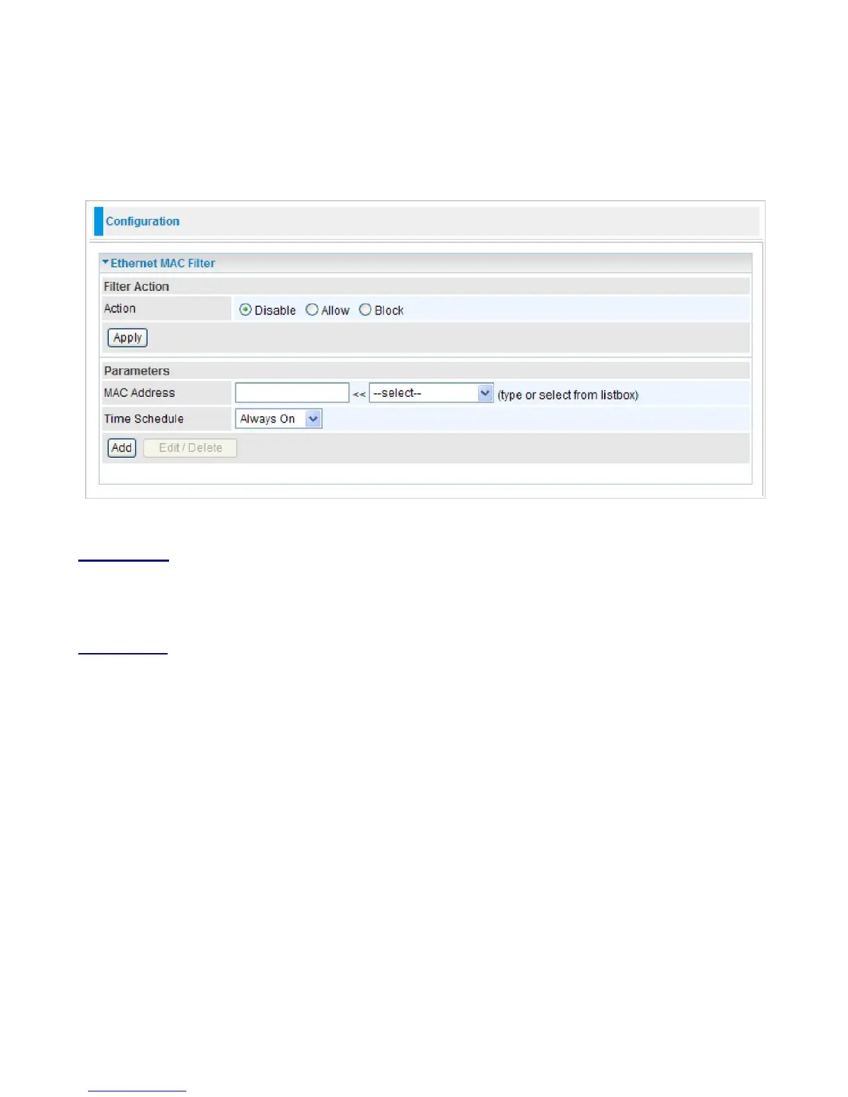 Select an action for MAC Filter. This feature is disabled by default. Check Allow or Block