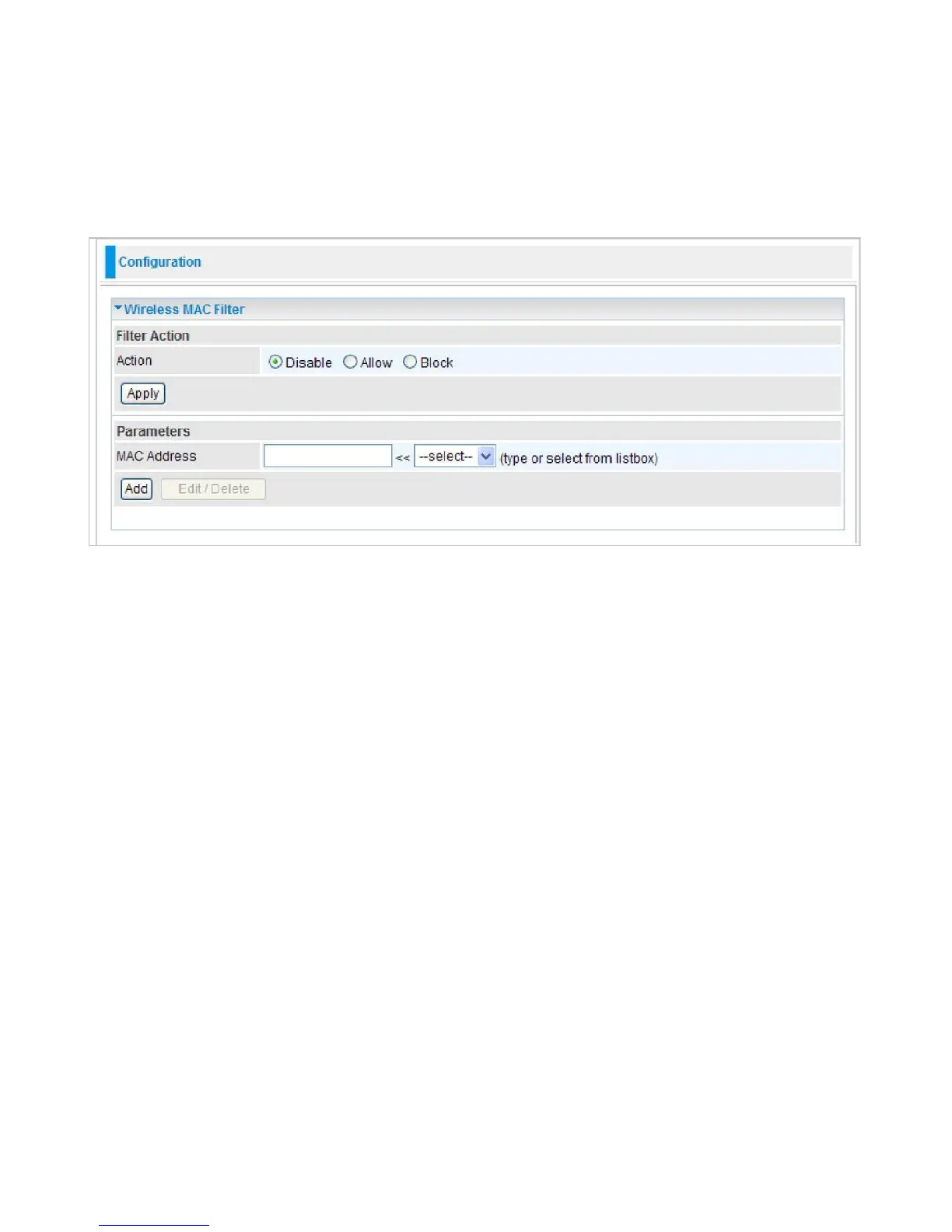 Select an action for MAC Filter. This feature is disabled by default. Check Allow or Block