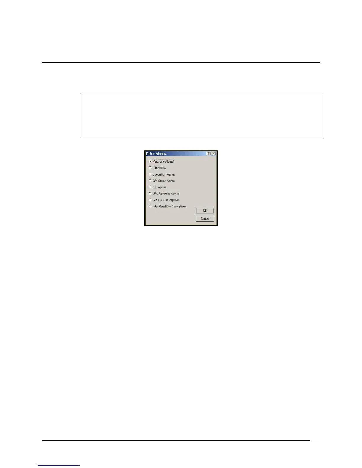 The Other Alphas screen lets the user assign names and descriptions for party lines, IFB's, UPL Resources, etc.