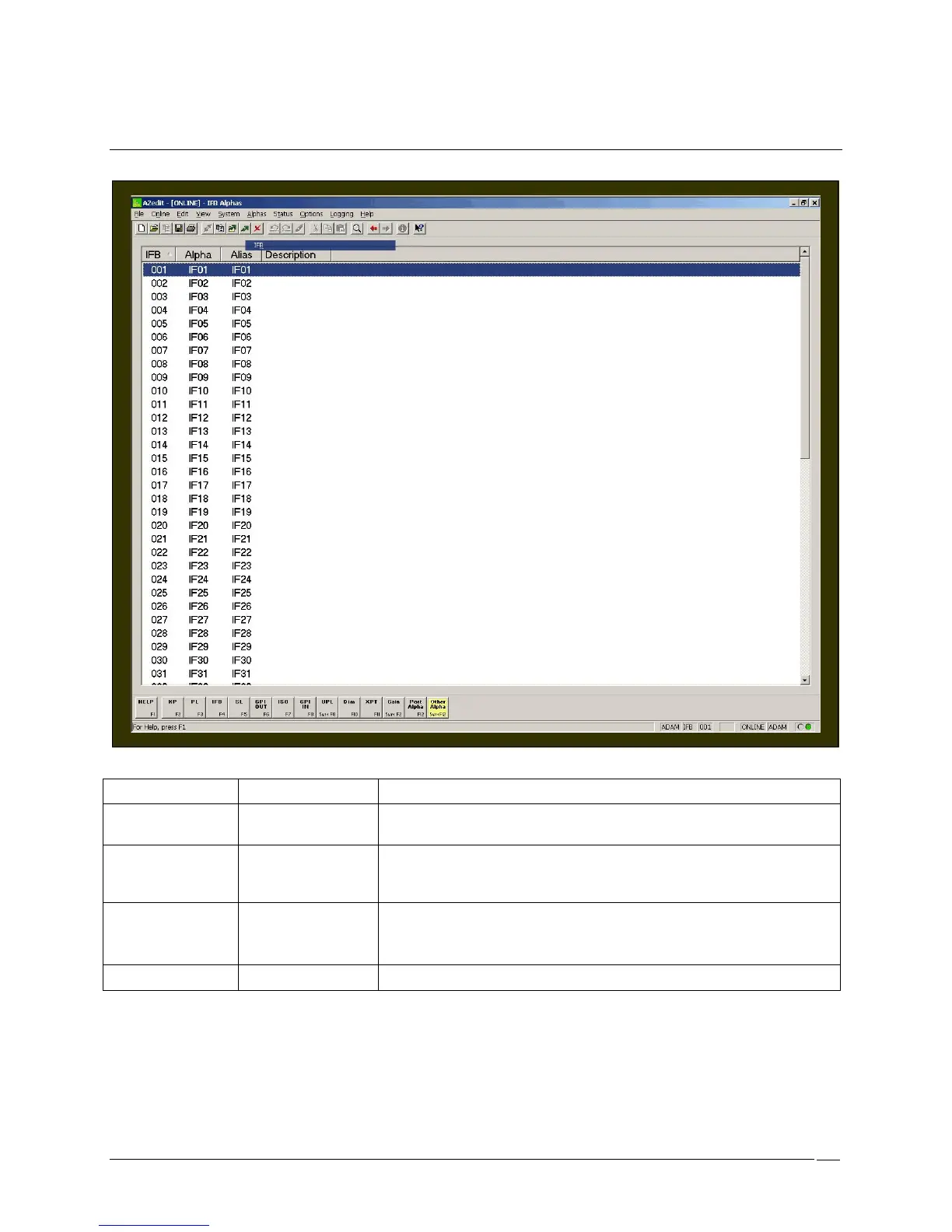 The Alpha column displays the name of the IFB. The default names