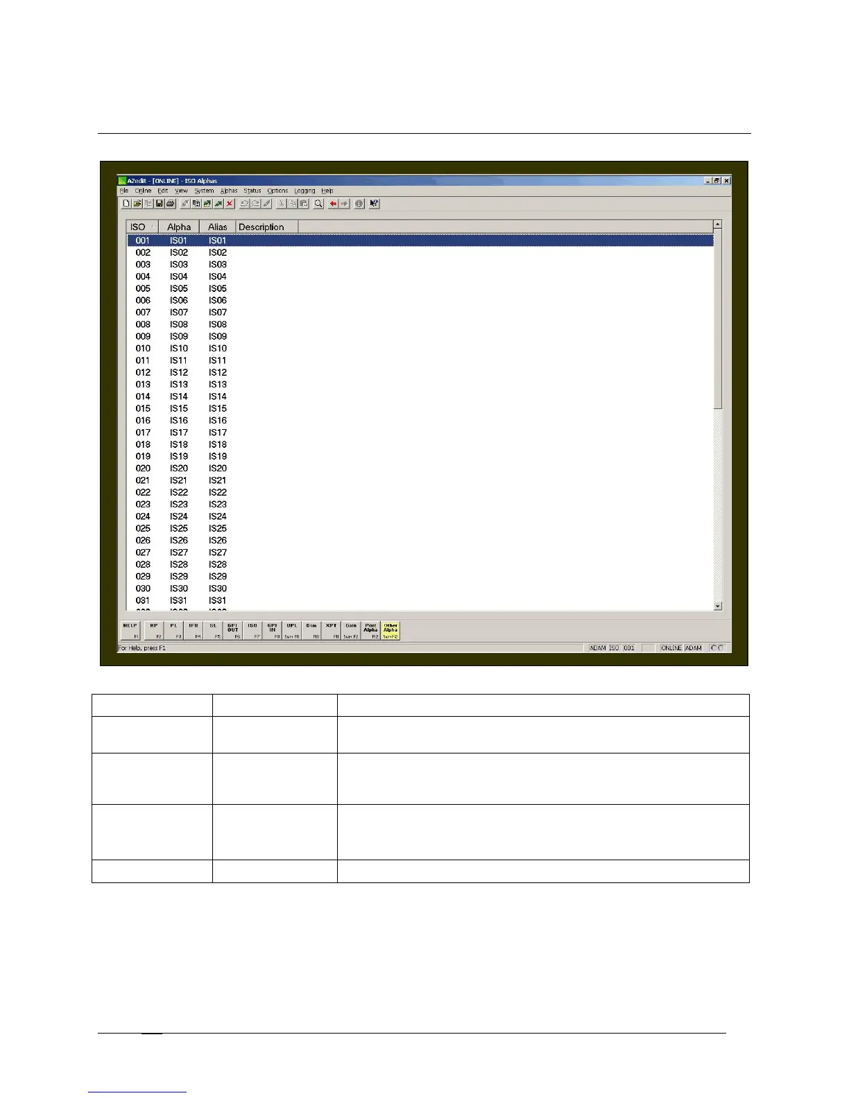 The Alpha column displays the name of the ISO. The default names