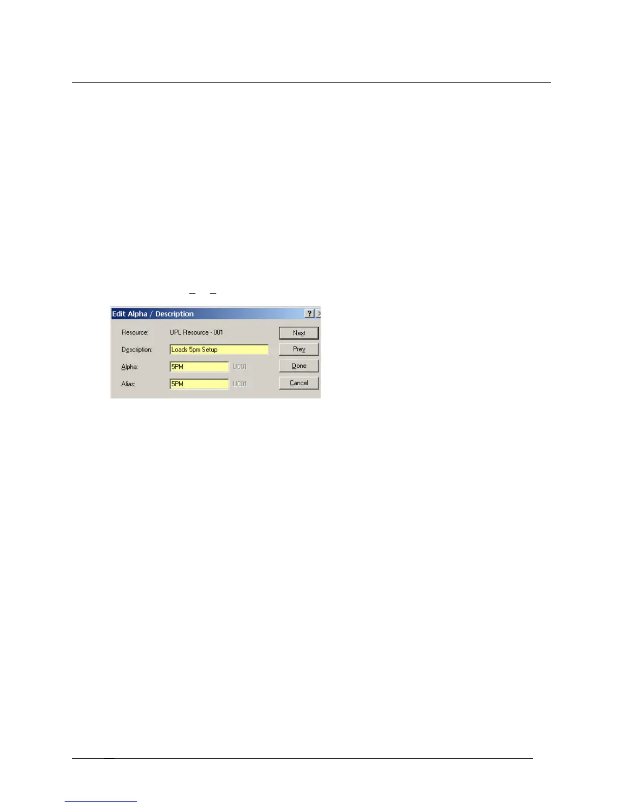 6. In the Alpha field, enter the name you want displayed as the UPL Resource (for example, 5PM). The Alpha