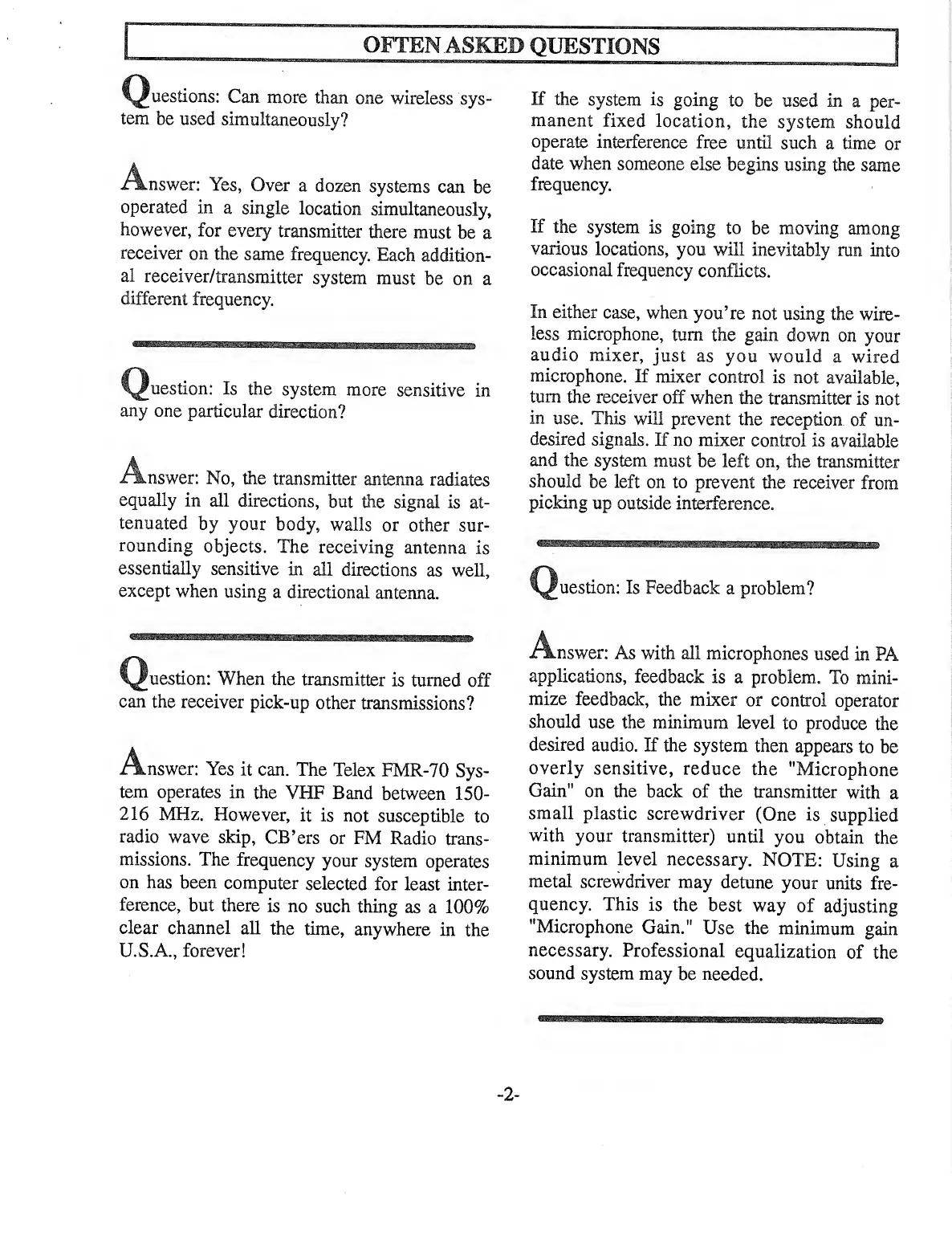 Telex FMR-70 - OFTEN ASKED QUESTIONS; Simultaneous System Use; Transmitter Antenna Sensitivity; Receiver Interference When Off