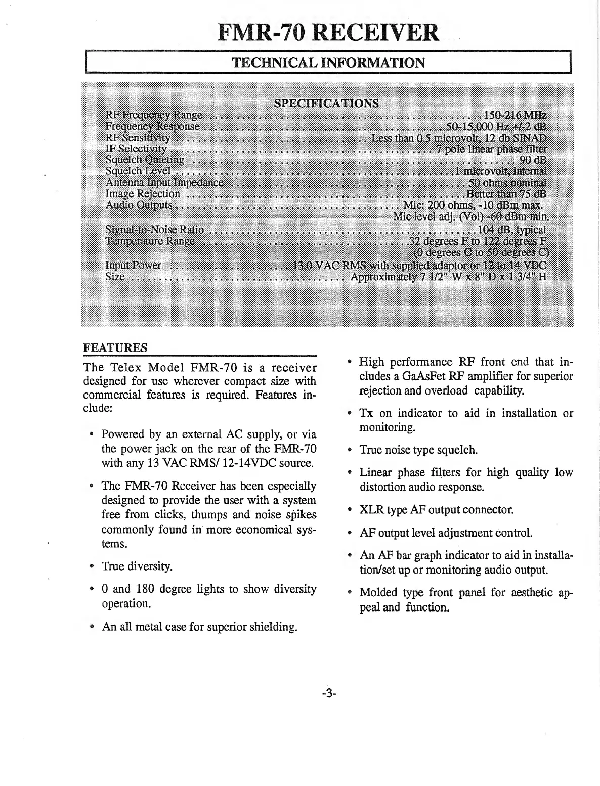 Telex FMR-70 - FMR-70 RECEIVER; TECHNICAL INFORMATION; FEATURES