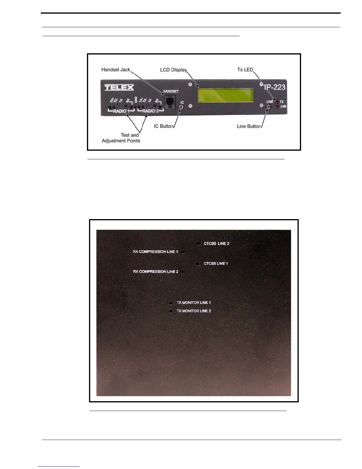 Test and adjustment points for Radio 1 and Radio 2 are provided on the front panel. Newer versions of the IP-223 provide