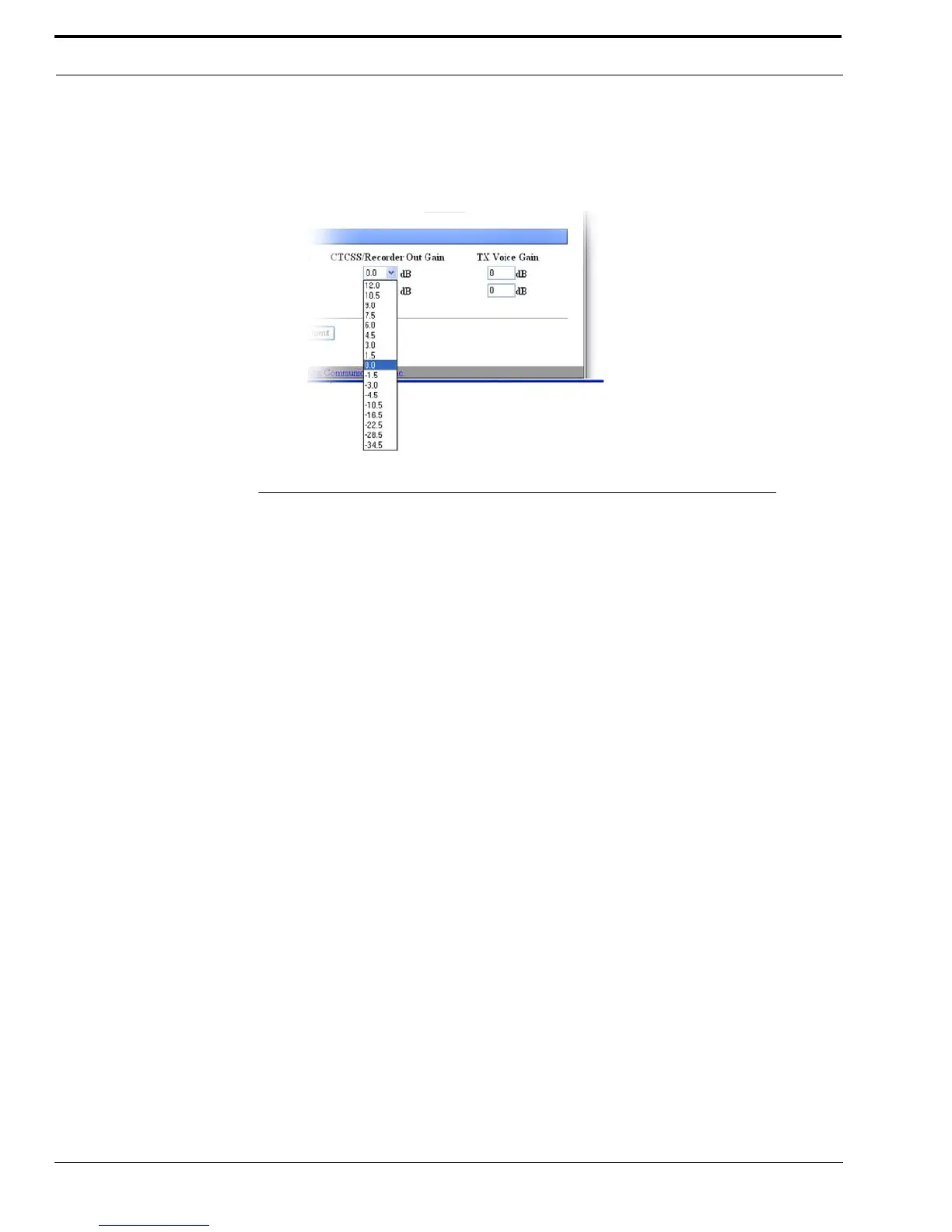 The CTCSS/Recorder Out Gain drop down menu is used to set the CTCSS/recorder gain, in dB, for either line 1 or line 2.