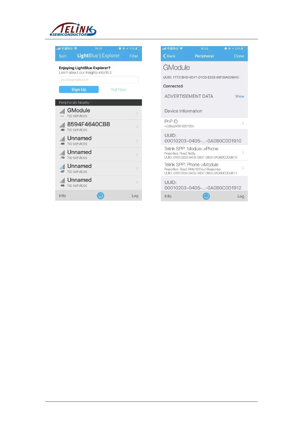 can see two “Telink SPP”, one is “Module->Phone” used for sending data to the phone
